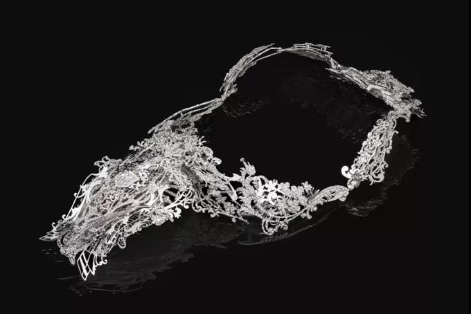 “田口史樹通過對主題和材質的巧妙處理,重新詮釋了胸針和吊墜。他的首飾似乎被精美的寶石所迷惑,通過不同的切割和角度折射出線條,藝術家通過將純銀雕鑿成一種模擬鉆石等寶石的光澤來達到這種效果。田口對銀的使用指向首飾價值的建構,暗示銀與貴重的巖石一樣光芒四射。田口曾說:“在不鑲嵌任何寶石的情況下,我常常使用制作寶石的結構來呈現金屬本身的力量和精致感。”胸針和吊墜類似于家族徽章或盾徽;通過破壞物質象征和清空徽章的肖像,胸針成為超越舊血統的新型關系的容器。”